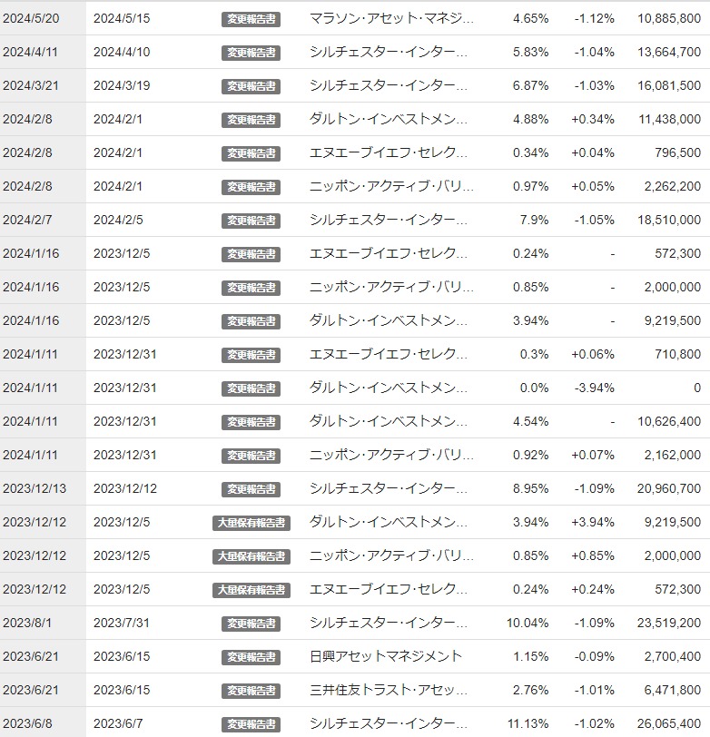 彼らだけではない。FMH株の大量保有報告書では、シルチェスターは4月10日時点で5.83%とシェアを下げたが、それと入れかわりに米国系のアクティビスト、ダルトン・インベストメンツが2月20日時点で4.88%まで増やしているのが目につく。ここは1999年にジェームズ・ローゼンワルド3世(James B. Rosenwald III)ら3人が創設したファンドで、翌2000年には東京にオフィスを構え、現在は日本で80社に投資している。