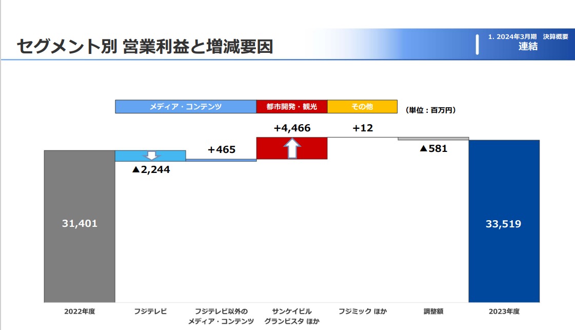 視聴率三冠王などと自画自賛していた1980年代の黄金期とどこが違うのか。稼ぎの大黒柱だったフジテレビが芳しくないからだ。コンテンツも経営戦略も時代についていけなくなった象徴といえる。23年3月期決算のセグメント別の営業利益を見てみよう。